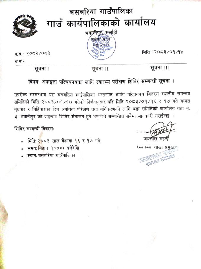 » अपाङ्गता परिचयपत्रका लागि स्वास्थ्य परीक्षण शिविर सम्बन्धी सूचना ।