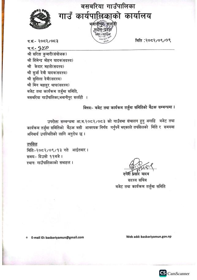 बजेट तथा कार्यक्रम तजुर्मा समितिको बैठक सम्वन्धमा