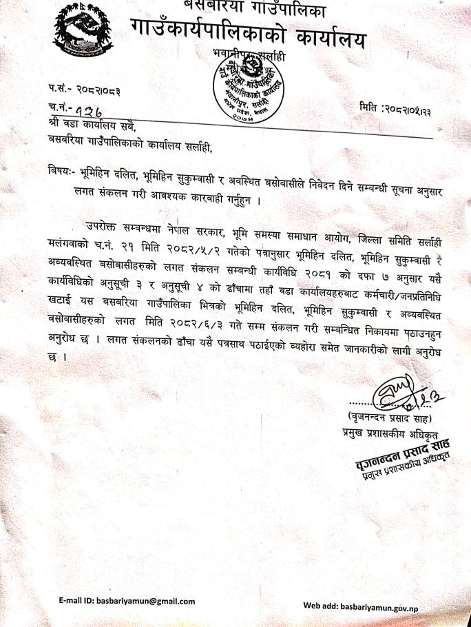 भूमिहिन दलित, भूमिहिन सुकुम्वासी र अवस्थित बसोबासीले निवेदन दिने सम्बन्धी सूचना अनुसार लगत संकलन गरी आवश्यक कारवाही गर्नुहुन ।