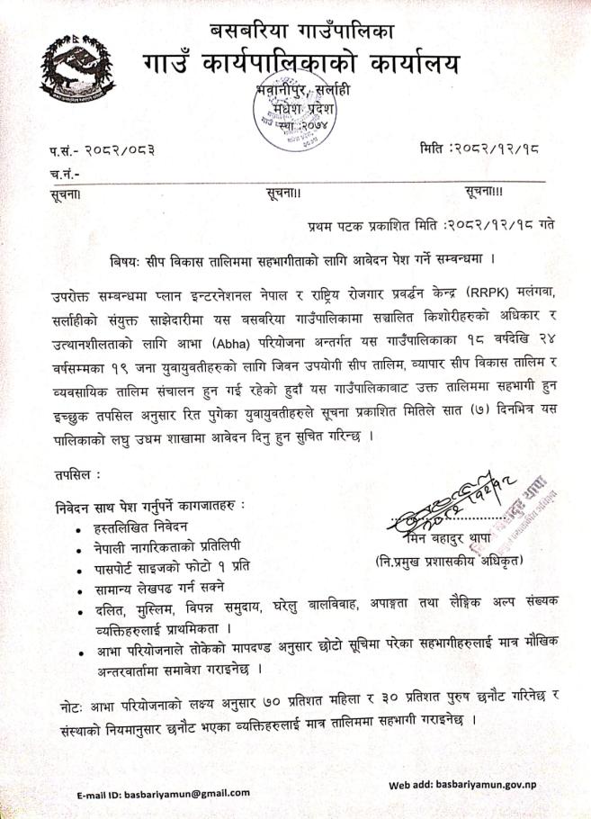 सीप विकास तालिममा सहभागीताको लागि आबेदन पेश गर्ने सम्वन्धमा ।